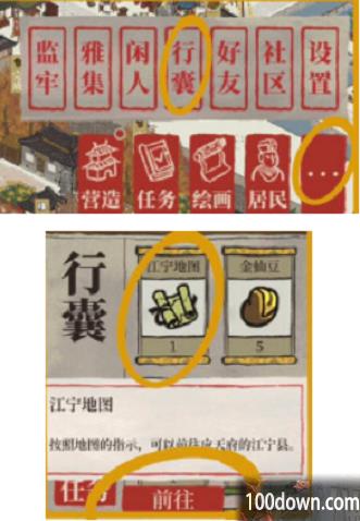 4、提交足够的云锦之后即可开启,玩家找到页面中的三个点,点击打开行囊,找到江宁地图,点击前往,接着就进入江宁地图了。