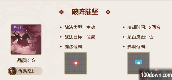 破阵摧坚:使前方六格敌军群体统率和智力降低35~70(受武力影响),持续1回合;并对其造成63%~126%兵刃伤害。