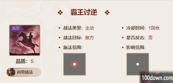 霸王讨逆:对敌军单体造成82%~164%兵刃伤害和1回合【震慑】,并将其击退2格;若目标在击退过程中被敌方武将阻挡,则对阻挡武将造成41%~82%兵刃伤害。