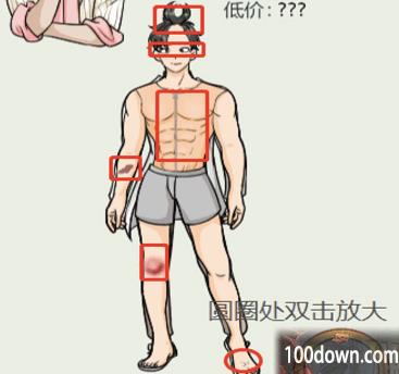 3、之后将放大镜移动到左边胳膊和左边膝盖上,玩家可以找到被遮住的胎记;