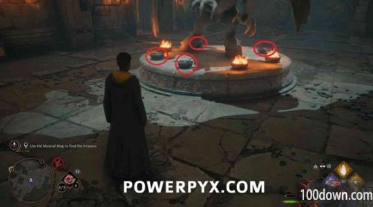 3、根据藏宝图上的提示,将下图红圈内的火盆全部点燃,其他火盆全部熄灭,就可以解开谜题了;