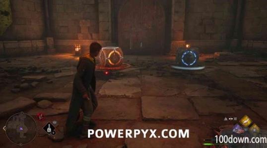 2、先用【飞来咒】将方块放到左侧地上机关处,对左边方块使用【火焰熊熊】,对右边方块使用【寒冰冻结】,后边的门就打开了;