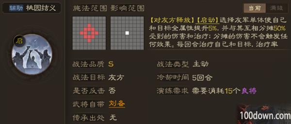 满级:选择友军单体使自己和目标全属性提升5%,并与其互相分摊50%受到的伤害和治疗,分摊的伤害不会触发任何效果,每回合治疗自己和目标,治疗率50%,受智力影响,持续至更换目标或刘备死亡后;