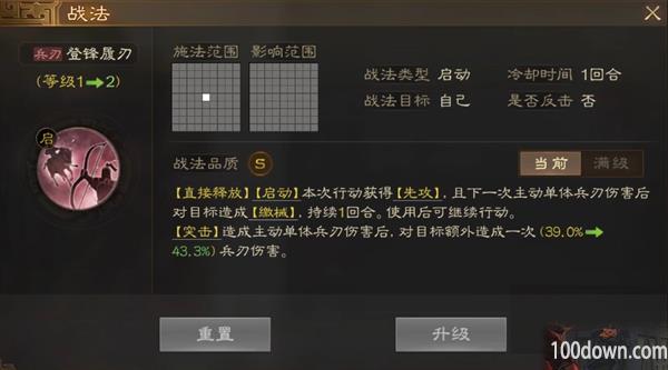 满级:本次行动获得【先攻】,且下一次【突击】后对目标造成【缴械】,持续1回合,【突击】对目标额外造成82%兵刃伤害;