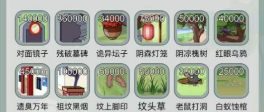 对面镜子、残破墓碑、诡异坛子、阴森灯笼、阴凉槐树、红眼乌鸦、遗臭万年、祖坟黑烟、坟上脚印、坟头草、老鼠打洞、白蚁蚀棺