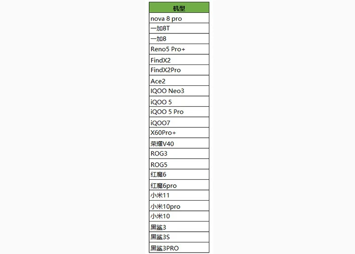 本次王者荣耀首发适配机型大部分都是国产安卓手机,其苹果和三星系列手机都没有进行适配,目前已经适配的手机型号有Nova 8 Pro、一加8T、一加8、Reno5 Pro+、findx2、findx2Pro、ace2、iQOO Neo3、iQOO5、iQOO5Pro、iQOO7、x60Pro+、荣耀v40、ROG3、ROG5、红魔6、红魔6Pro、小米11、小米10Pro、小米10、黑鲨3、黑鲨3s、黑鲨3Pro。