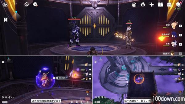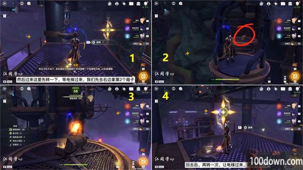 3、到到位置后先旋转1下地上的开关,让电梯过来先去右边拿第2个宝箱;