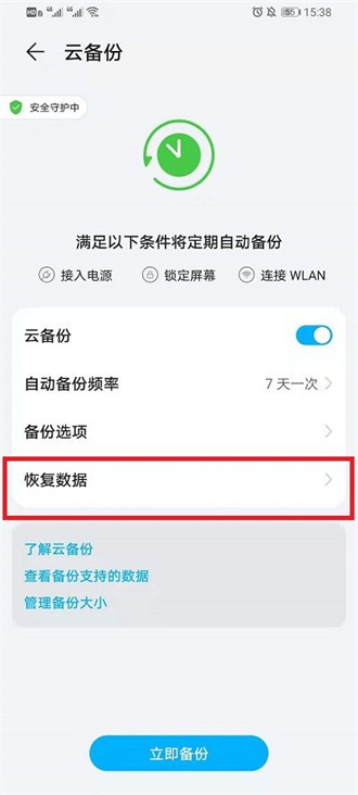 3、进入【云备份】页面里,点击【恢复数据】选项。