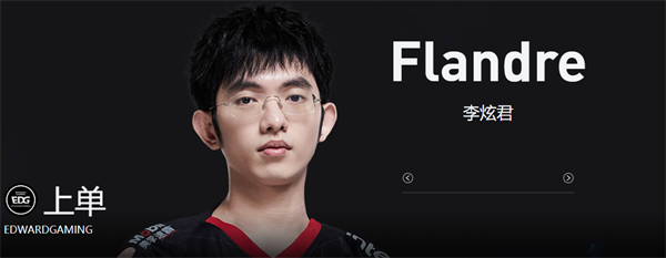 个人履历:flandre(圣枪哥)是一名国产上单,2014年4月正式加入LPL职业联赛,从2014年-2019年5月效力于SS战队,2019年5月-2020年11月效力于LNG战队,2020年12月正式加入EDG英雄联盟分部,从当年初出茅庐的杂技上单,到如今联赛熟知的顶尖上单,flandre在LPL联赛给观众们留下了不可磨灭的记忆,至今已经在LPL达成了3000助攻成就。作为一名征战多年的老将,他的状态一直保持稳健,不管是调节队内气氛还是在赛场上做出的贡献都极高,是EDG不可或缺的一员,随队出征2021年LOL全球总决赛并获得冠军。