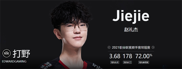 个人履历:Jiejie是通过EDG青训体系培养出来的一名年轻选手,在2019年夏季赛以首发身份正式登场加入LPL,并且在当年2019年全明星周末拿到了新生挑战赛MVP荣誉,随队出征2021年LOL全球总决赛并获得冠军。