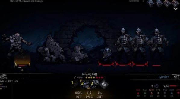 强盗(一回合二动)单挑四个守卫,没多少挑战性。2技能从后排推进,再用1技能膝击,守卫攻击会把强盗推回后排,则再用2技能前进;有守卫会使用吸气技能准备吹号(加压),此时强盗在后排的话可以用3技能丢石头打断他。
