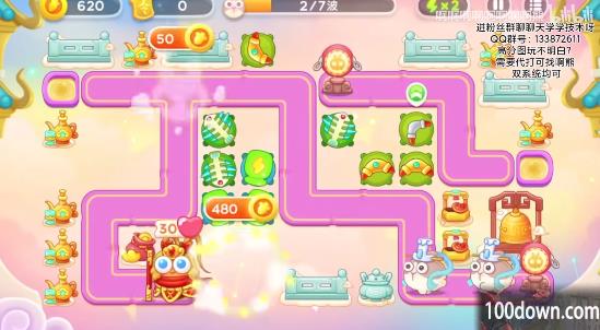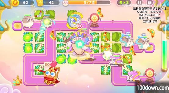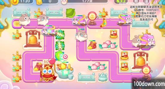 4、后面等天兵出现的时候,要顺着她的移动方向打,不够的话再补几个炮塔,记得要锁定速度快的兔子。