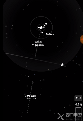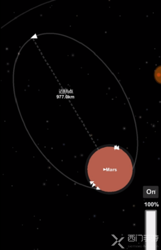 7、继续加速时间,将时间加速到近地点,到达近地点后就可以控制火箭和火星形成一个圆规点了;