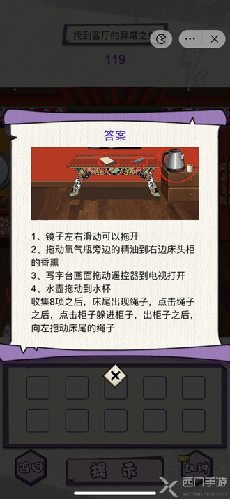 收集8项之后,床尾出现绳子,点击绳子之后,点击柜子躲进柜子,出柜子之后,向左拖动床尾的绳子。