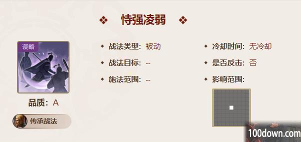 恃强凌弱:主动谋略伤害提升5%~10%。若是对处于【中毒】状态的敌军造成主动谋略伤害,则会恢复自身兵力,治疗率14%~28%,受智力影响。每回合最多触发3次。