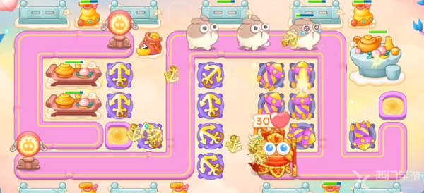 1、开局之后,现在右侧萝卜的上下放两个烟花炮,有钱升满级,先打炉子,等兔子来的时候打兔子;