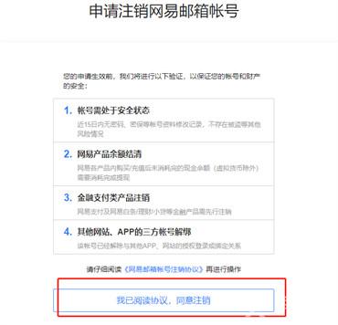 4、最后在申请注销网易邮箱账号的页面中点击【我已阅读协议,同意注销】即可;