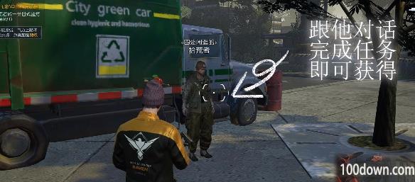 2、在这个位置附近,玩家可以在一辆大卡车的旁边找到四处闲逛的拾荒者,和他对话完成任务即可获得藏宝图。