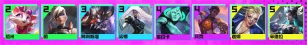 悠米、蔚、阿利斯塔、娑娜、索拉卡、艾克、迦娜、辛德拉、蕾欧娜