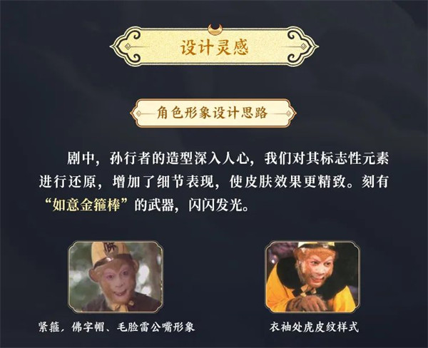 剧中,孙行者的造型深入人心,我们对其标志性元素进行还原,增加了细节表现,使皮肤效果更精致。刻有“如意金箍棒”的武器,闪闪发光。