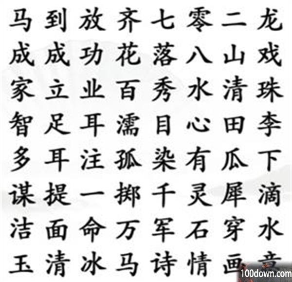 成语:马到成功、百花齐放、七零八落、二龙戏珠、成家立业、山清水秀、足智多谋、耳濡目染、心有灵犀、瓜田李下、耳提面命、孤注一掷、千军万马、滴水穿石、冰清玉洁、诗情画意