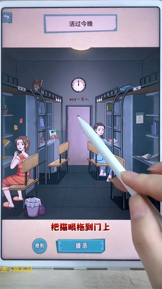 2、有人敲门,玩家点击床上的小猫咪,猫咪的眼睛会变成门上的猫眼可以观察外面。