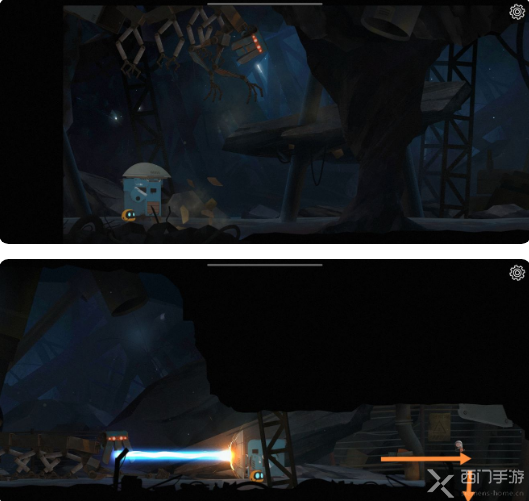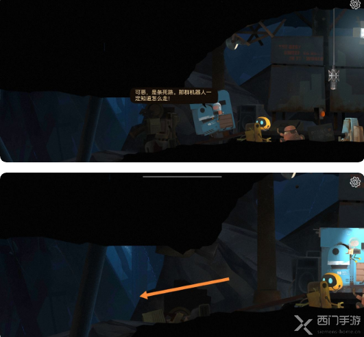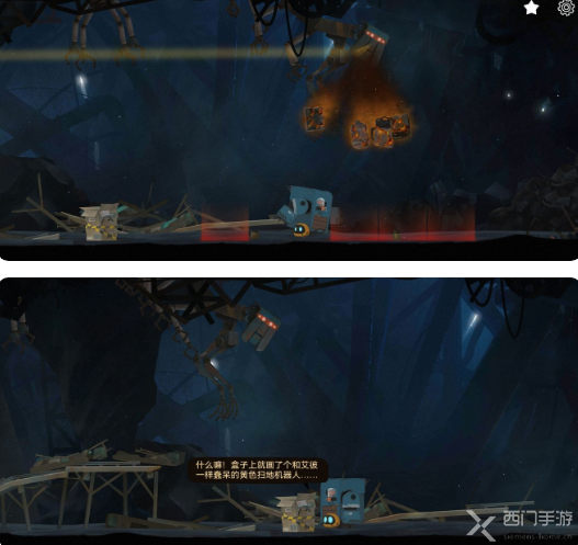 1、第四关最后过剧情的时候,突然一只手把我们扯了下去。摔落后往右走。我们会遇到一个小机器人,用大块头的迪迪解救他并和他对话。他告诉我们得赶快逃走,有什么会来追我们;