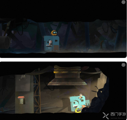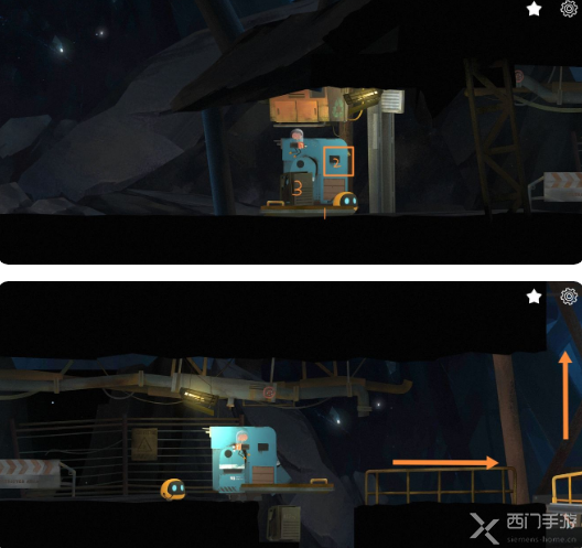 6、来到地下后我们捡起盖子在洞口处放下,再点击按钮,落下一个大方块。我们依次捡起大方块和盖子,补齐缺口铺路,向右搭乘电梯逃走;