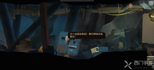 8、路上黑漆漆的,艾彼有些害怕,操作迪迪将艾彼放到头上向右走,点击被堵住的洞口。收集者追来打开开关将我们传送走;