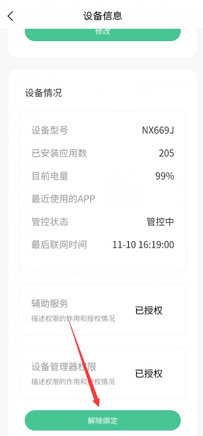 2、点击后进入管控设备的详情界面,点击下面的【删除该设备】选项;