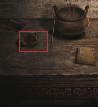 17、回到纸人的屋子里面,在台子上面蘸取红墨水,给纸人画上腮红和嘴巴;