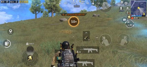 6、跑毒:游戏中每段时间会开始缩小安全区,这时候玩家就需要跑毒,在安全区外将会掉血,可通过右上角小地图查看缩圈倒计时、缩圈位置,尽量在倒计时结束前到达安全区;