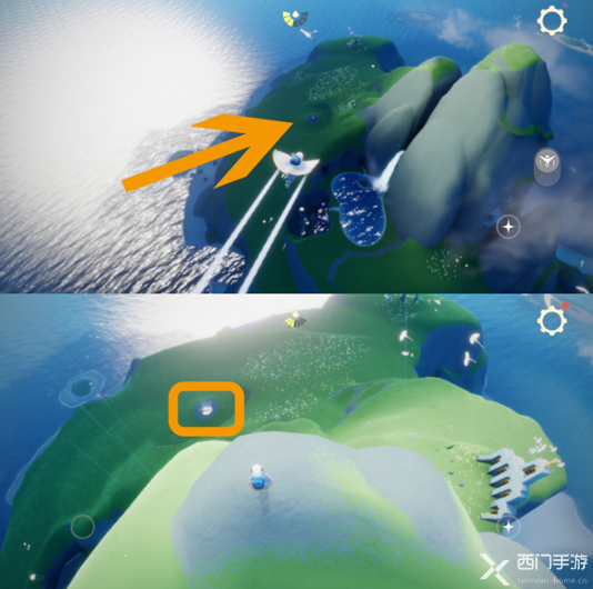 玩家穿过云野右侧云顶浮石来到圣岛后,直接飞到三层瀑布左侧的喷气泉水前就可以看到先祖了。