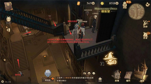 2.然后玩家们来到城堡主楼沿着楼梯一直往上走就能够来到校长室(也可以直接利用地图进入校长室);