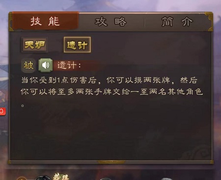 遗计--当你受到1点伤害后,你可以摸两张牌,然后你可以将至多两张手牌交给一至两名其他角色。