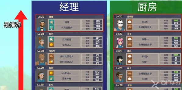 大堂要满足清理>鸡尾酒=饮料≥芥末,四个技能都要有。经理锁死德瑞的情况下,由于他的清理高优先度+855高服务,个人认为不用补清理人员。那么补一个饮料一个芥末。
