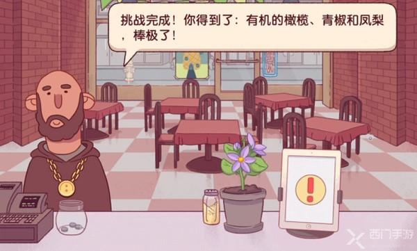 4、完成制作交给顾客之后就可以获得顾客的满意,然后就会解锁有机的橄榄、青椒、凤梨食材,获得好评。