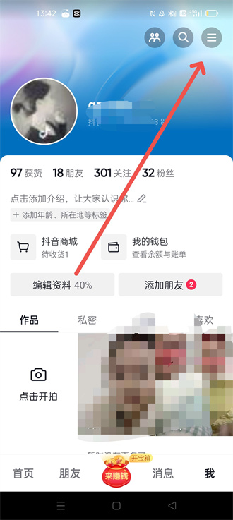2、进入【个人主页】后,找到并点击右上角的【三横】。