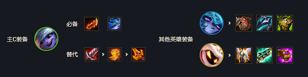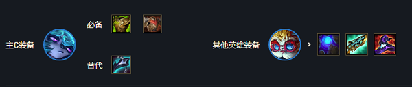 薇古丝作为主C装备肯定优先给他,薇古丝是作为前排坦克使用的,又肉又有输出,所以狂徒铠甲+荆棘背心是他必备的装备,另外黑默丁格是副c,主要负责打伤害,因此给他的全都是输出装以及蓝霸符,其他成员不是很需要装备。
