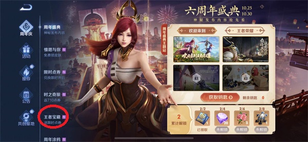 2、来到活动页面以后玩家们可以看到周年庆活动,接着往下滑动就可以看到王者宝藏活动;