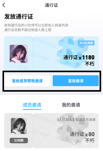 3、进入通行证功能界面后可以查看自己拥有的通行证,作为频道主的话可以选择【发给成员帮助邀请】或者自己【直接邀请】;