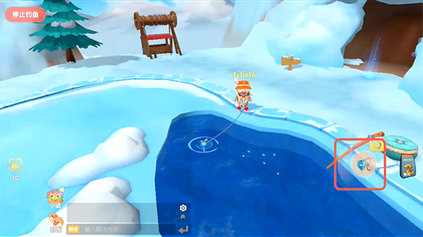 ②靠近雪山鱼塘,在右侧点击切换使用的鱼饵;