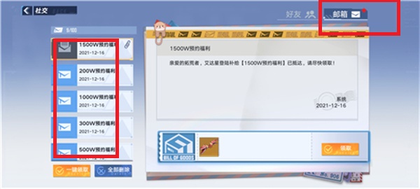 4、在好友的界面选择右上的【邮件】进行领取预约奖励就可以了哦。