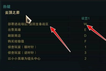 3、再左侧的【热键】中,玩家可以自由的设置快速上阵or撤回鼠标指定英雄的快捷键,比如设置成W键,(上阵和人下阵是同一个键);