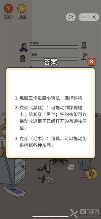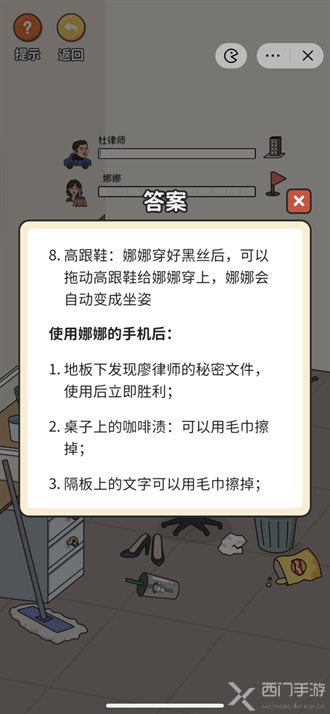 使用娜娜的手机后:1.地板下发现廖律师的秘密文件,使用后立即胜利;