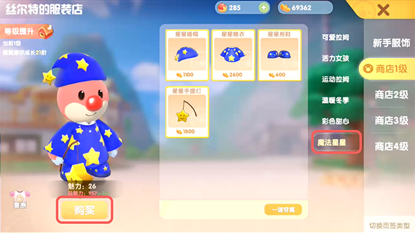 ③在右侧切换到【商店1级】选择【魔法星星】套装,花费摩尔豆购买即可。
