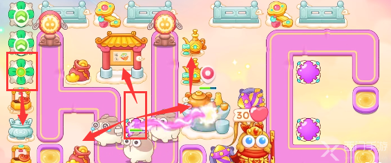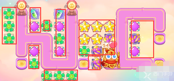2、烟花炮先清理萝卜上方的道具,清理完放置烟花炮,然后往右侧清理放魔法球,之后往左清理,顺序可以参考下图: