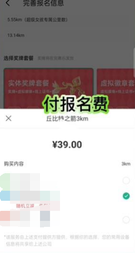 5、这个比赛是需要付款的,价格是39,选择好之后付款然后参与活动完成自己填写的跑步公里数就可以获得丘比特之箭,这个丘比特之箭是这个活动的实体奖牌,还是很好看的。