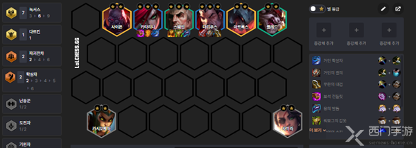 阵容成员:沙弥拉+蛇女+塞恩+卡特+乌鸦+诺手+剑魔+克烈。
