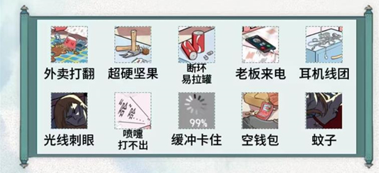 外卖打翻、超硬坚果、断环易拉罐、老板来电、耳机线图、空钱包、喷嚏打不出、缓冲卡住、光线刺眼、蚊子